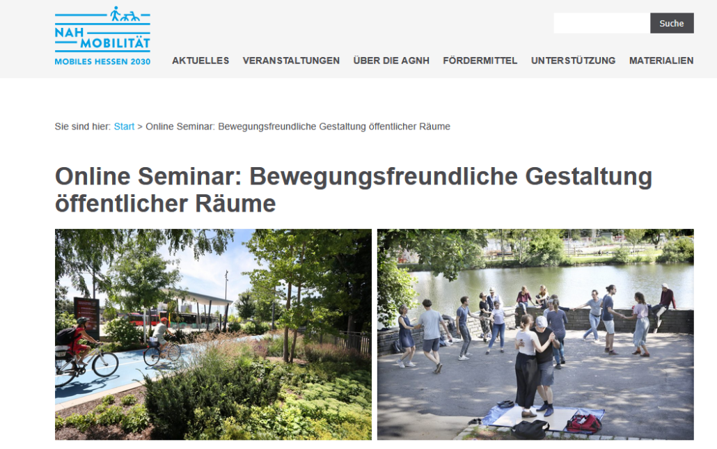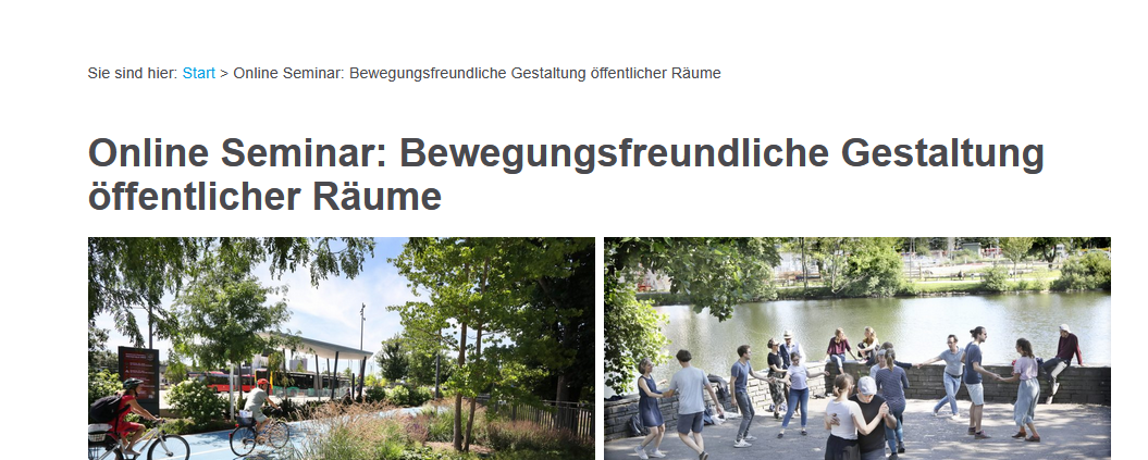 Der öffentliche Raum ist die größte frei verfügbare Fläche, um bewegt aufzuwachsen, bewegt zu bleiben und bewegt zu altern. Bewegungsfreundlich gestaltet kann er dazu beitragen, gesundes Leben, Bewegung, Begegnung und das soziale Miteinander zu stärken. Doch warum bewegen wir uns dann zu wenig? Oftmals fehlen Bewegungsanreize durch eine bewegungsfreundliche Gestaltung. Im Online-Seminar „Bewegungsfreundliche Gestaltung öffentlicher Räume“ beschäftigen wir uns mit der Frage, wie öffentliche Räume einladender werden können, um als Bewegungsräume wahrgenommen und genutzt zu werden.