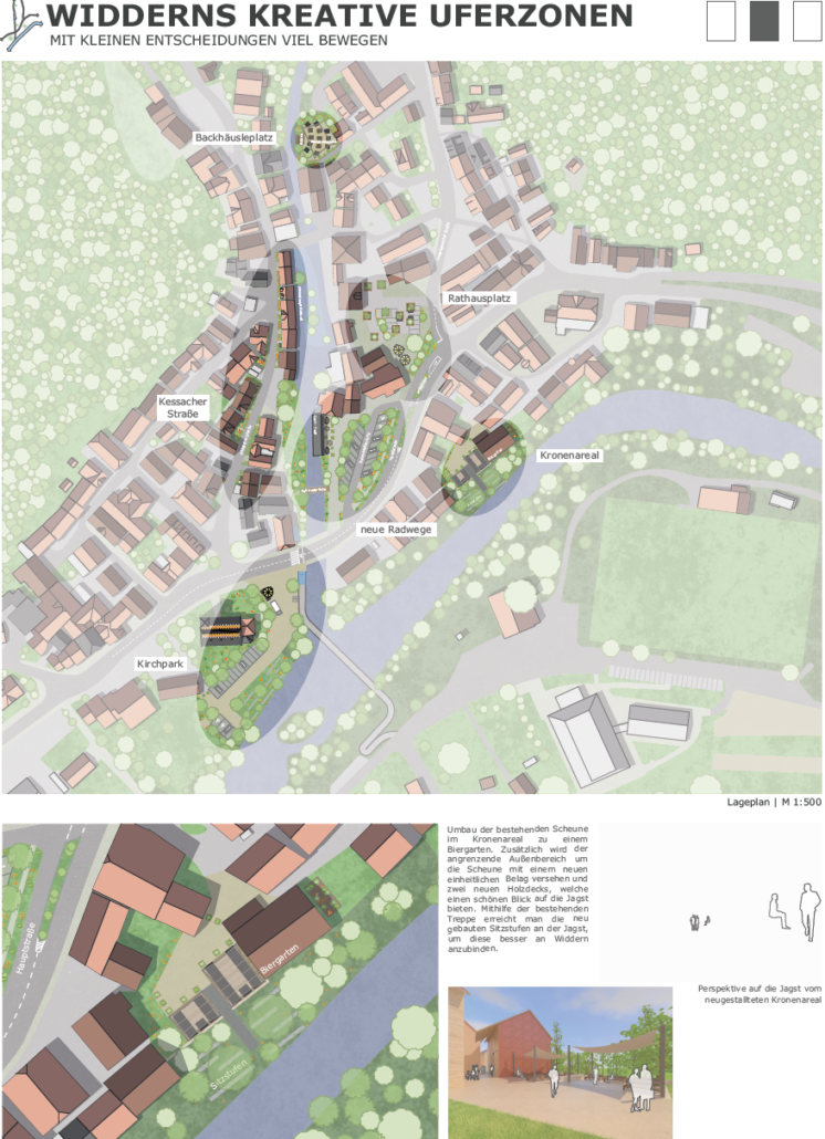 Für die Studierenden sind Praxisaufgaben wichtig, damit sie an konkreten Beispielen lernen können, welche Aspekte bei der Ortsentwicklung wichtig sind und wie mit den Wünschen und Anforderungen von Bürgerschaft und Politik umgegangen werden kann. Die Themen in Widdern sind vergleichbar mit vielen weiteren Orten im ländlichen Raum: hohe Verkehrsbelastung, hoher Parkdruck, vernächlässigte Freiräume, fehlende Ortsmitte, Leerstand, Hochwasserschutz. Gleichzeitig gibt es vor Ort viele kreative Ideen. Und damit lässt sich etwas anfangen.